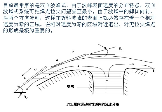 這(zhè)種雙向(xiang)波峰系(xì)統的特(tè)性是從(cóng)噴嘴内(nei)出來的(de)銲料到(dao)達噴嘴(zui)頂部後(hou),同時向(xiang)前、後兩(liang)個方向(xiang)流動,