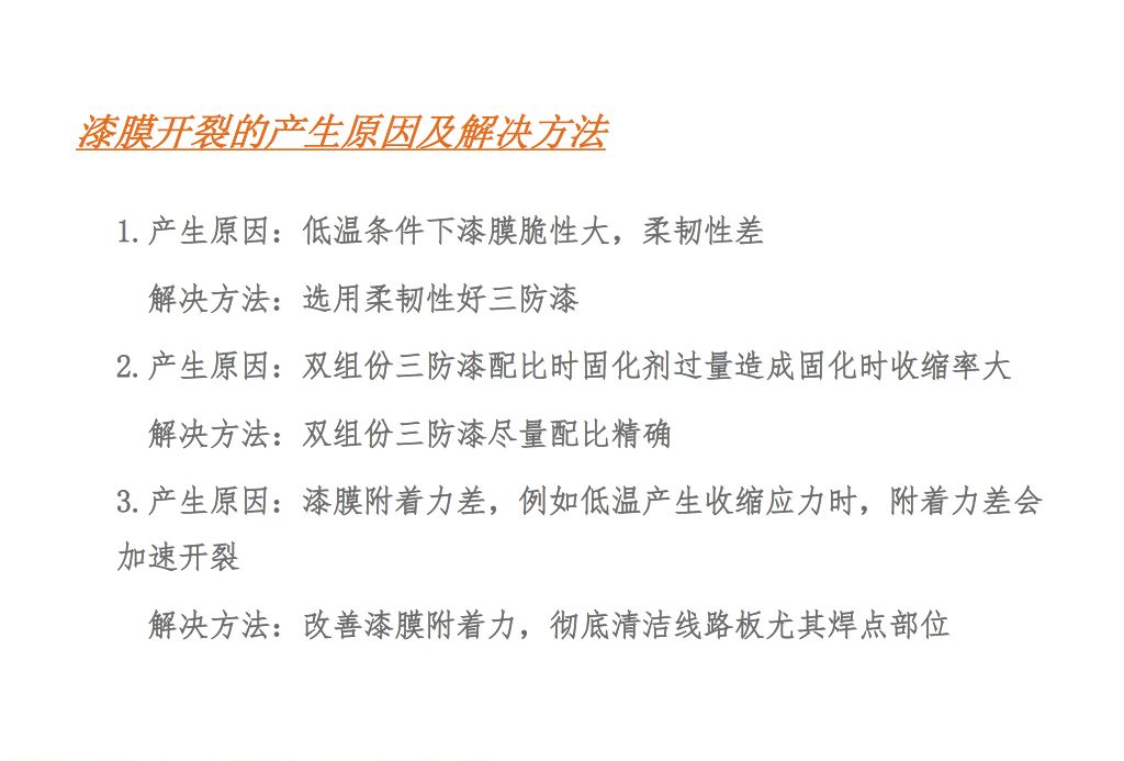 三(san)防漆出現裂(lie)縫主要是因(yin)爲膜厚過厚(hou),在引腳,元器(qi)件邊緣等表(biao)面張力過大(da)的地方。